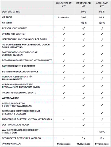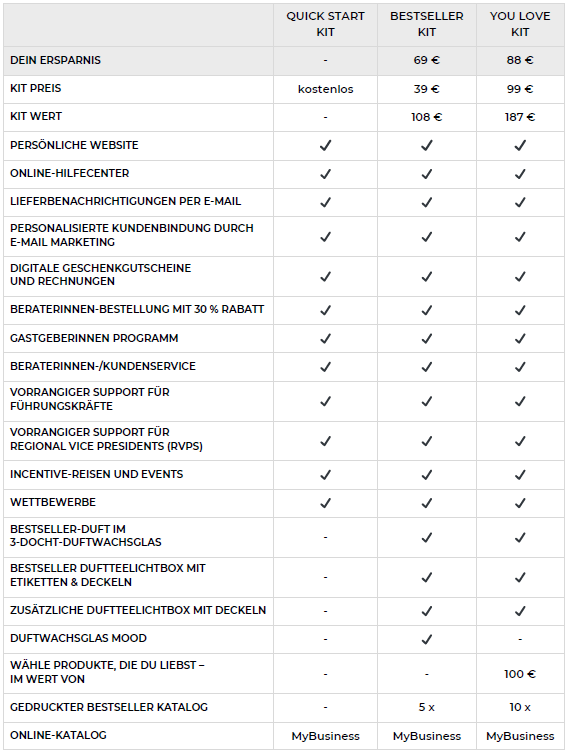 Für den Start gibt es allerdings drei verschiedene Pakete, aus denen du wählen kannst – je nachdem, wie du beginnen möchtest. Sie unterscheiden sich vor allem im Umfang der Produkte und Materialien, die du zum Kennenlernen und Arbeiten nutzen kannst.